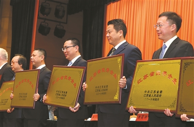 4月8日, 江苏省委、省政府在南京召开全省推进供给侧结构性改革工作会议,13个先进开发区受到表彰。图为受到表彰的省优秀企业代表领奖。