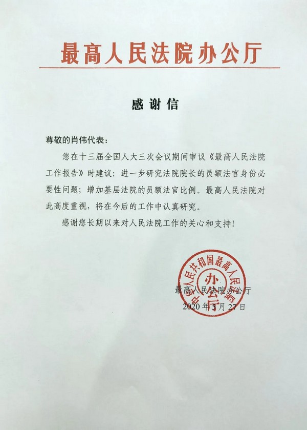 在审议《最高人民法院工作报告》时,肖伟提出:进一步研究法院院长的员额法官身份必要性问题;增加基层法院的员额法官比例。建议受到最高人民法院的高度重视,表示将在今后工作中认真研究。