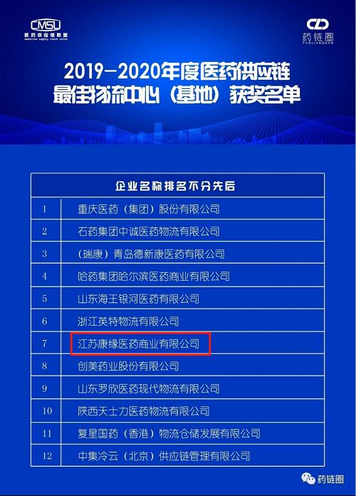 经过业内众多专家审核,和网上投票两个阶段的综合评选,江苏康缘医药商业有限公司荣获“2019-2020年度医药供应链物流最佳服务企业”、“2019-2020年度最佳物流中心(基地)”两项殊荣。