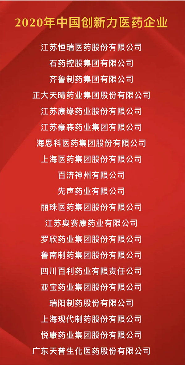 康缘药业荣登“2020年中国创新力医药企业”榜单