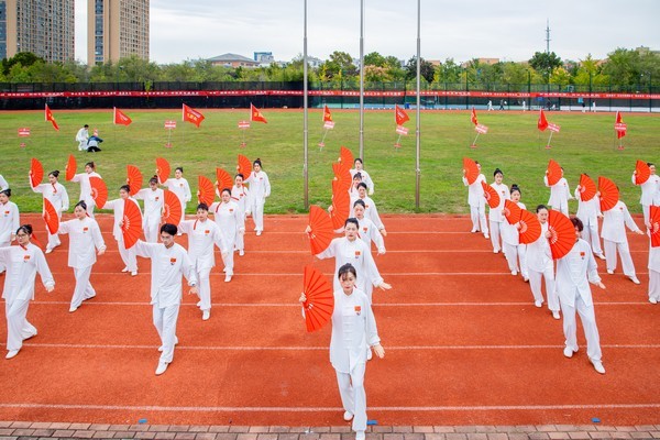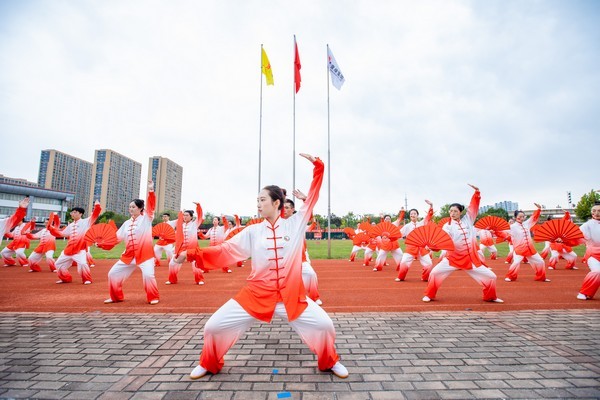 康济“杏林”队率先出场,身着太极练功服,手持红色太极扇,刺扇、挂扇、劈扇……整齐的动作、响亮的声音点燃全场。各参赛队伍逐一展示,用“白鹤亮翅”“蛟龙入海”“攒拳怒目增气力”等招式展示传统体育项目的独特魅力,一招一式行云流水、一拳一脚动静相生,现场掌声阵阵。