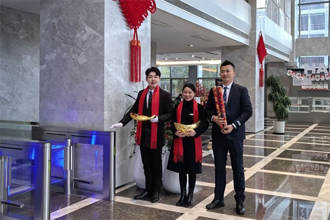 早上8时18分,开工仪式准时开始。集团领导向全体职工发表新年开工贺词,随后,三车18响礼炮向天齐发、响彻云霄,伴着热烈的掌声、欢呼声,每个人都在心里擘画着集团更美好的蓝图,用笑意和祝福传递着属于康缘人的感动与自豪。