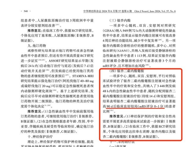 6月8日,暌违五年的《中国急性缺血性卒中诊治指南2023》在中华神经科杂志2024年6月第57卷第6期发表,以期体现急性缺血性卒中全面诊治管理的最新规范,指导临床医师工作。基于神经保护的多项国内外RCT研究,推荐个体化应用银杏二萜内酯葡胺等(Ⅱ级推荐,B级证据)。以下截取自原文: