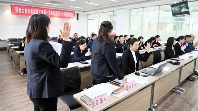 此次大会通过民主程序自下而上严格筛选、推选产生会员代表,会员代表无一缺席,认真行使表决权,真正能够充分代表职工意愿。候选人经过提前充分酝酿、征求各方意见,是职工利益的忠实代言人。经会员代表表决,大会通过了主席团建议名单、选举办法(草案)、计票人监票人建议名单、候选人名单及情况简介,会议选举产生了大物业事业部工会第一届委员会委员、经审委员、女工委员。会上,总监票人报告选举票数报告后,由曹小保代表大会主席团宣布,刘静娟当选大物业事业部工会第一届工会主席,杜文乐、刘增禹、姜岩岩、吴琳当选委员。同时,刘增禹当选经审委员,姜岩岩当选女工委员。