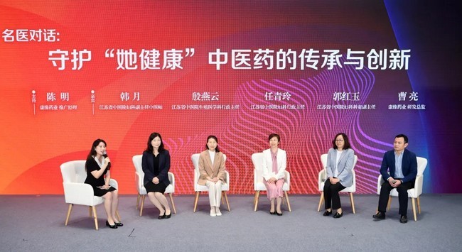 在“守护‘她健康’,中医药的传承与创新”名医对话环节,江苏省中医院妇科行政主任任青玲、江苏省中医院生殖医学科行政主任殷燕云、江苏省中医院妇科科室副主任郭红玉、江苏省中医院妇科副主任中医师韩月、康缘药业研发总监曹亮等中医药专家和学者思想碰撞激荡出智慧火花。